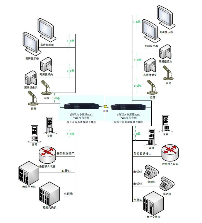 在光纖上傳輸8路雙向非壓縮HDMI+8路雙向音頻+百兆網絡或千兆+1-32路電話磁石等業務+4-16E1等,2U機架式設備 |